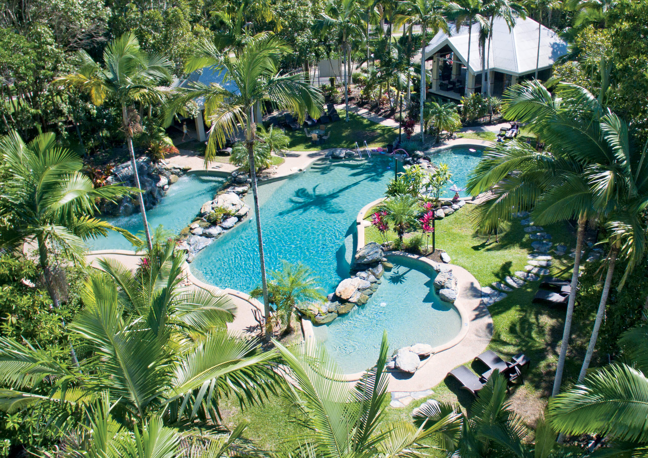 Three Bedroom Villa views include spectacular green fairways and lush tropical gardens. Available with king, queen, two single beds. Features full kitchen, Nespresso coffee maker, lounge & dining area, 2 bathrooms, hair dryer , downstairs powder room, laundry with washing machine & clothes dryer, iron & ironing board, air conditioning & ceiling fans, private balcony area, TV, DVD & Foxtel. Rooms serviced weekly for bookings 8 nights or more.