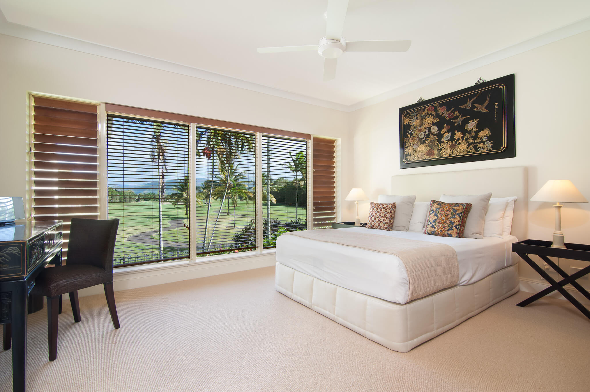 Villa Paradise is an immaculately presented four-bedroom, double storey Villa to accommodate up to 8 people, with its very own private swimming pool, perfect for lazing away those holidays in the sunshine. It offers stylish, contemporary Asian-inspired design and furnishings, completely embracing the tropical way of living, as well as presenting spectacular views over the fourth tee in a luscious garden setting. The villa features a full kitchen any private chef would feel very comfortable in, sprawling open-plan lounge and dining areas and an expansive outdoor living area. Upstairs is the sumptuous master bedroom with ensuite, spa, walk-through wardrobe and magic views, while downstairs has a second master suite with walk-in robe and ensuite. The upstairs level also has a separate queen bedroom and a twin room, alongside another fully equipped guest bathroom.
