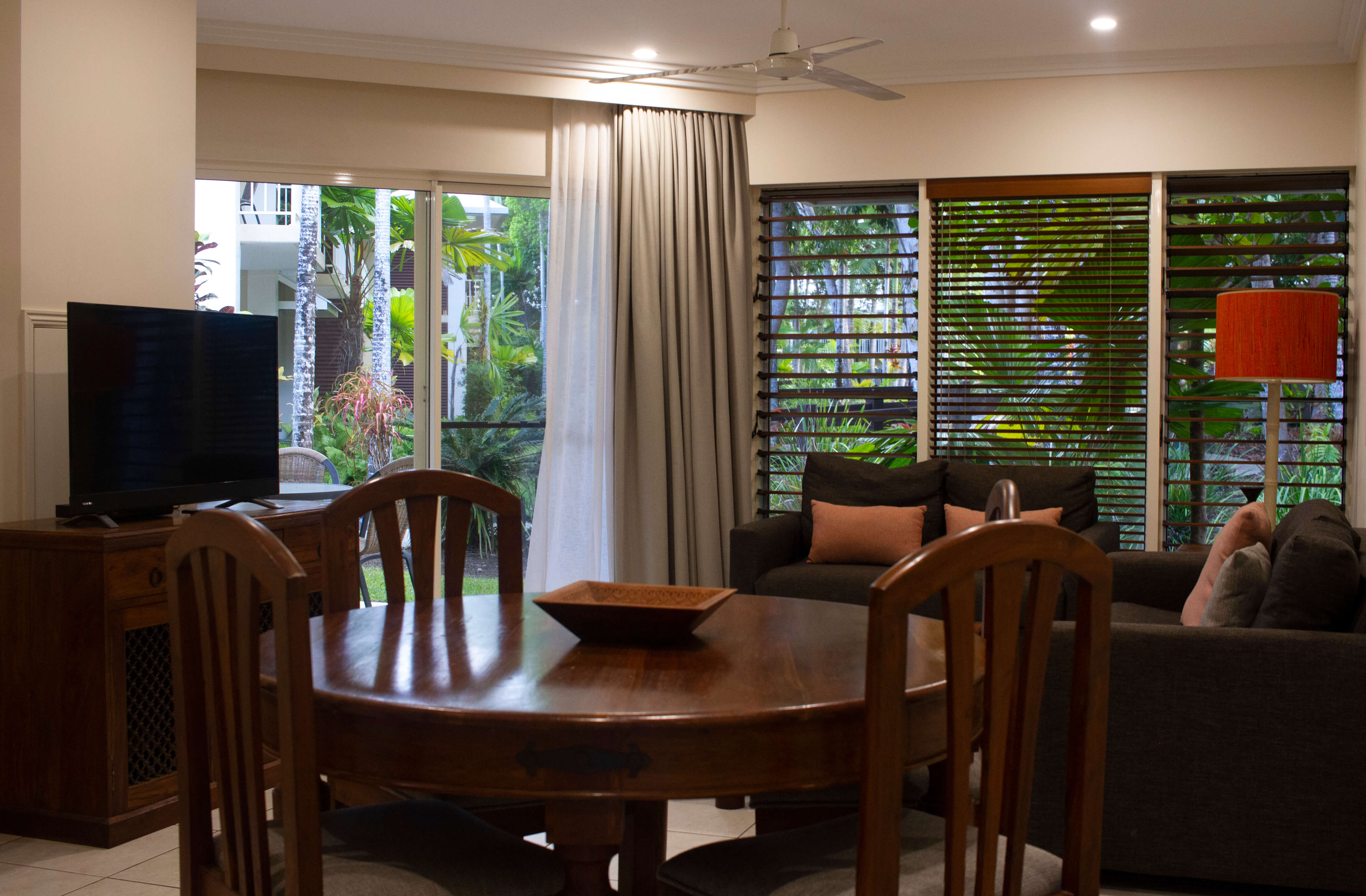 Two Bedroom Apartment views include lush tropical gardens and the lagoon style swimming pool. Available with one queen bed and one king, or one queen and two single beds. Full kitchenette, Nespresso coffee maker, microwave convection oven & gas top, two separate bathrooms, hairdryer and own balconies. Washing Machine & Dryer, iron & ironing board. Â Air conditioned & ceiling fans, TV, DVD & Austar. This is an interconnecting dual key suite. Rooms serviced weekly for bookings 8 nights or more.