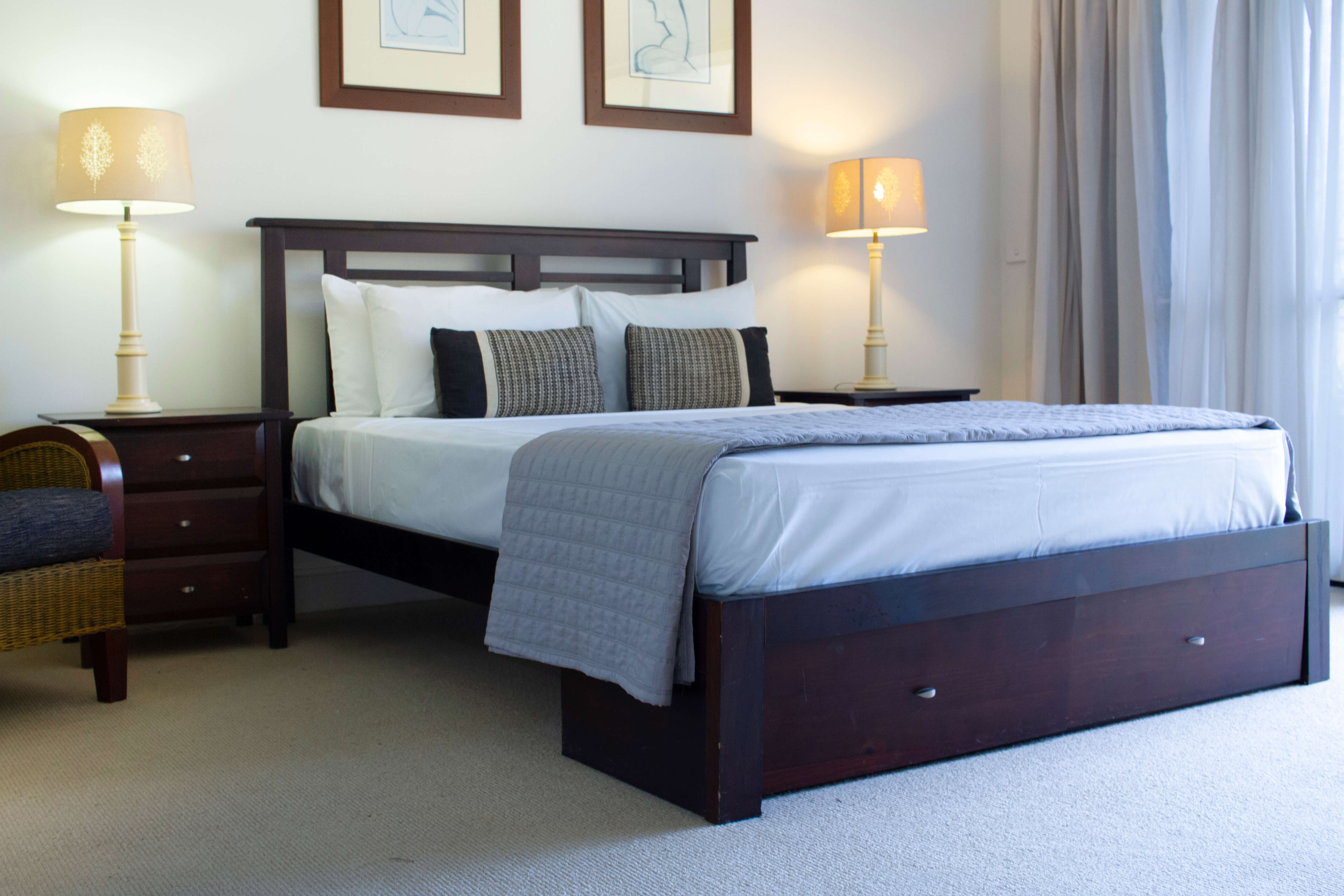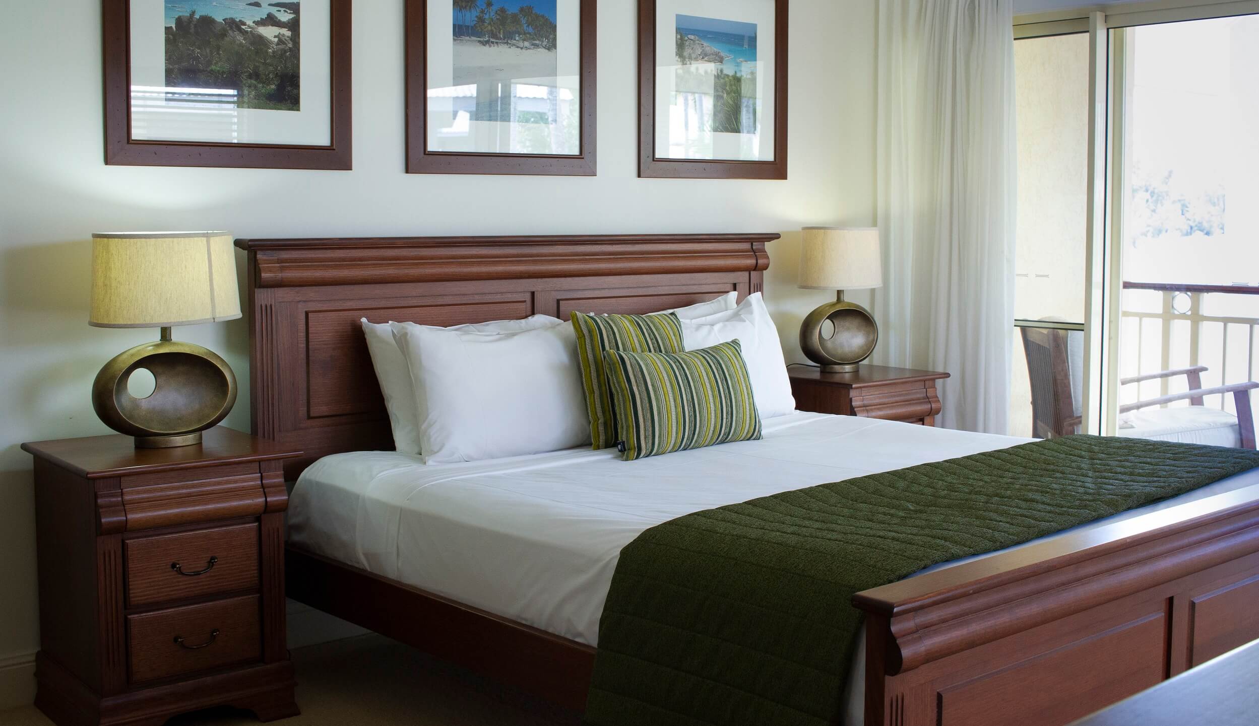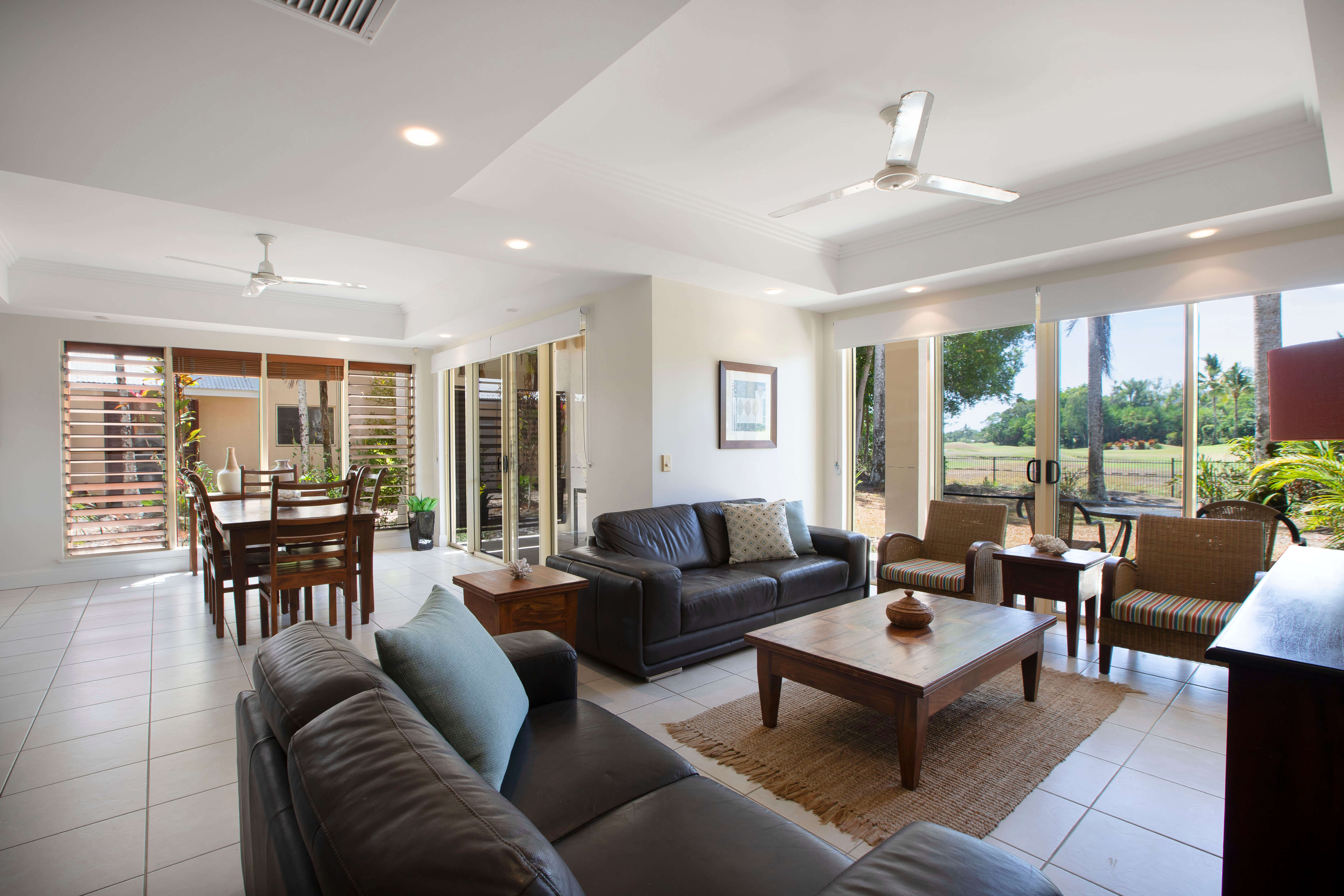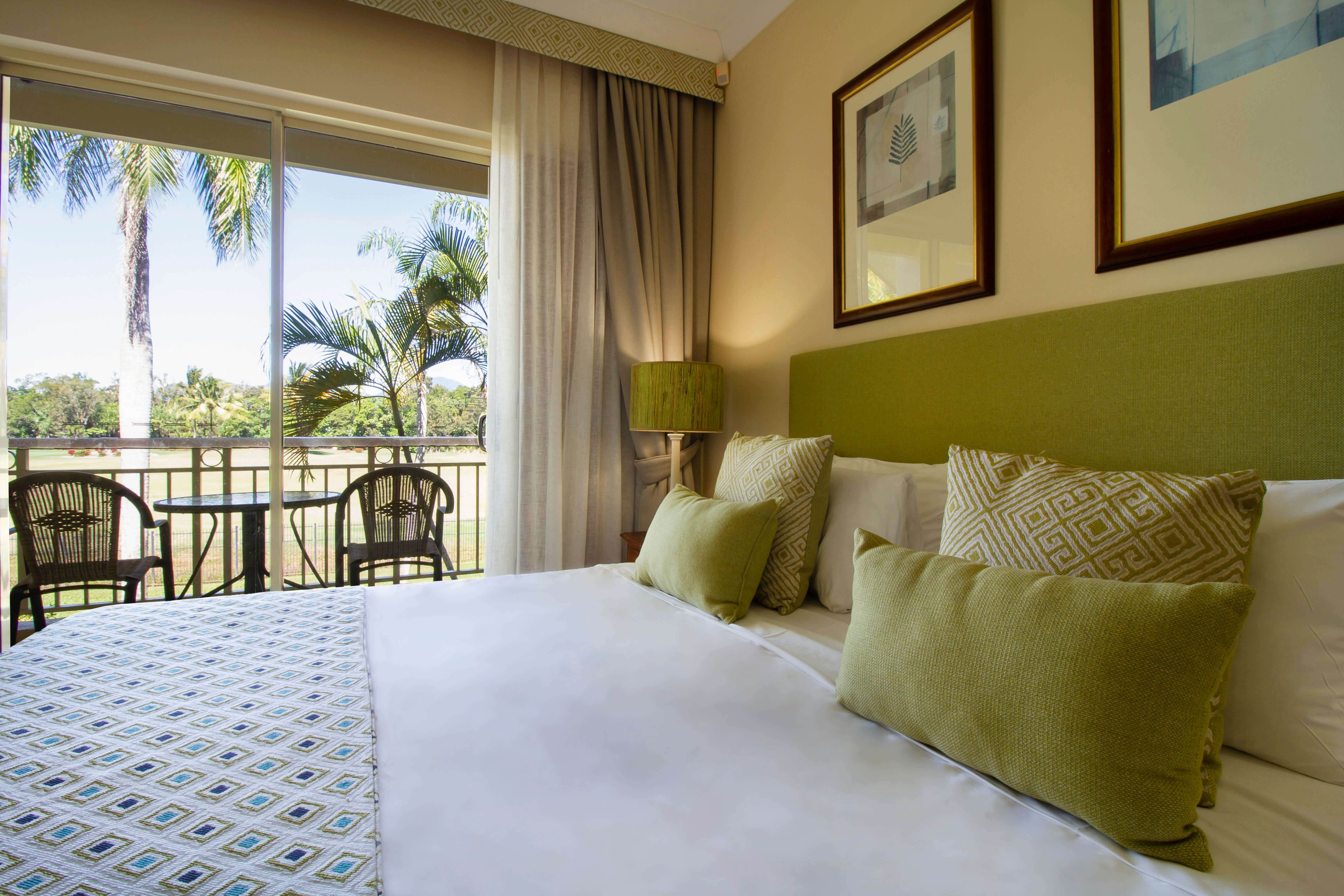 Four Bedroom Villa views include spectacular green fairways and lush tropical gardens. Available with king, two queen & two single beds. Features full kitchen, Nespresso coffee maker, lounge & dining area, 3 separate bathrooms, hair dryers, a powder room, laundry with washing machine & clothes dryer, iron & ironing board, air conditioning & ceiling fans, TV, DVD & Foxtel, private upstairs and downstairs balcony areas. Rooms serviced weekly for bookings 8 nights or more.