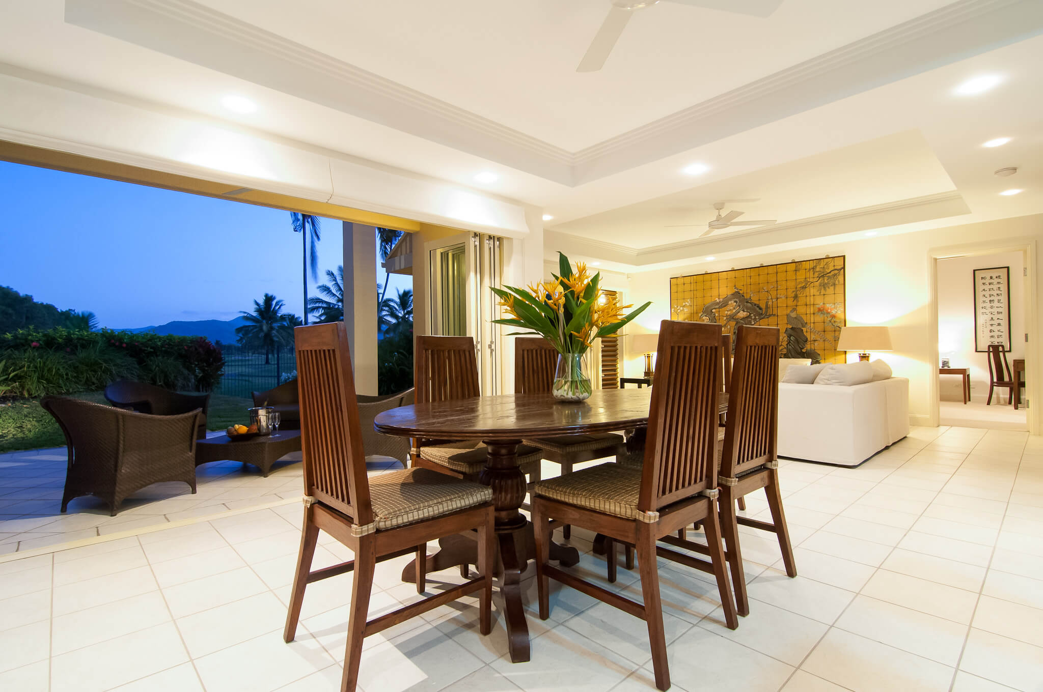 Villa Paradise is an immaculately presented four-bedroom, double storey Villa to accommodate up to 8 people, with its very own private swimming pool, perfect for lazing away those holidays in the sunshine. It offers stylish, contemporary Asian-inspired design and furnishings, completely embracing the tropical way of living, as well as presenting spectacular views over the fourth tee in a luscious garden setting. The villa features a full kitchen any private chef would feel very comfortable in, sprawling open-plan lounge and dining areas and an expansive outdoor living area. Upstairs is the sumptuous master bedroom with ensuite, spa, walk-through wardrobe and magic views, while downstairs has a second master suite with walk-in robe and ensuite. The upstairs level also has a separate queen bedroom and a twin room, alongside another fully equipped guest bathroom.