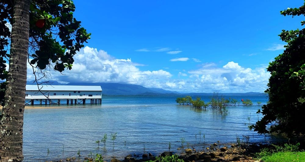 preserved historic pier stretching gracefully over the sparkling waters on the Port Douglas waterfront, offering breathtaking panoramic